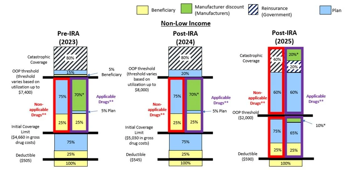 The Inflation Reduction Act (IRA) continues to change the landscape in Medicare Prescription Drug Plans (PDP). First the good news. In 2025 there will be a new $2,000 maximum out of pocket for your drug costs and the gap or donut hole will be eliminated. This will be a big help for people who take a lot of expensive medications. There will be a $590 deductible on most plans then you pay 25% until your out of pocket threshold of $2,000 is met.